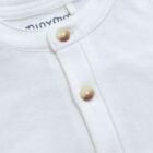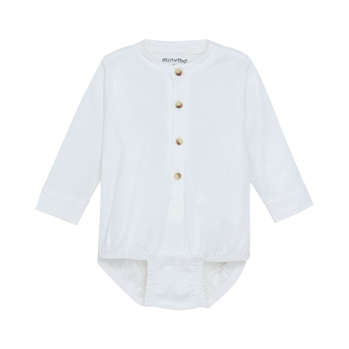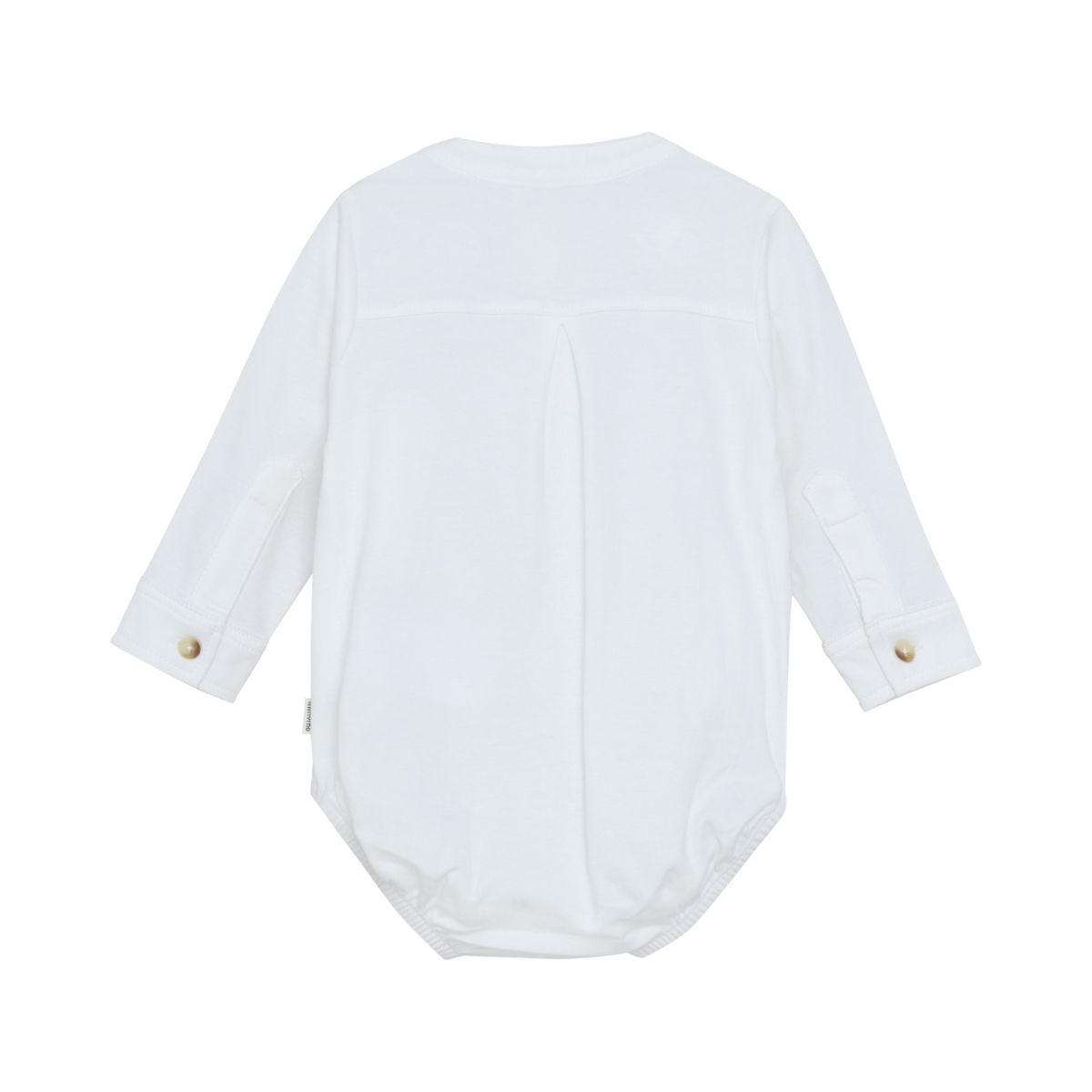 Elegant Minymo bodysuit in white. The Bodysuit has a collar and fine buttons at the front. It has long sleeves with cuffs and closes between the legs with push buttons.