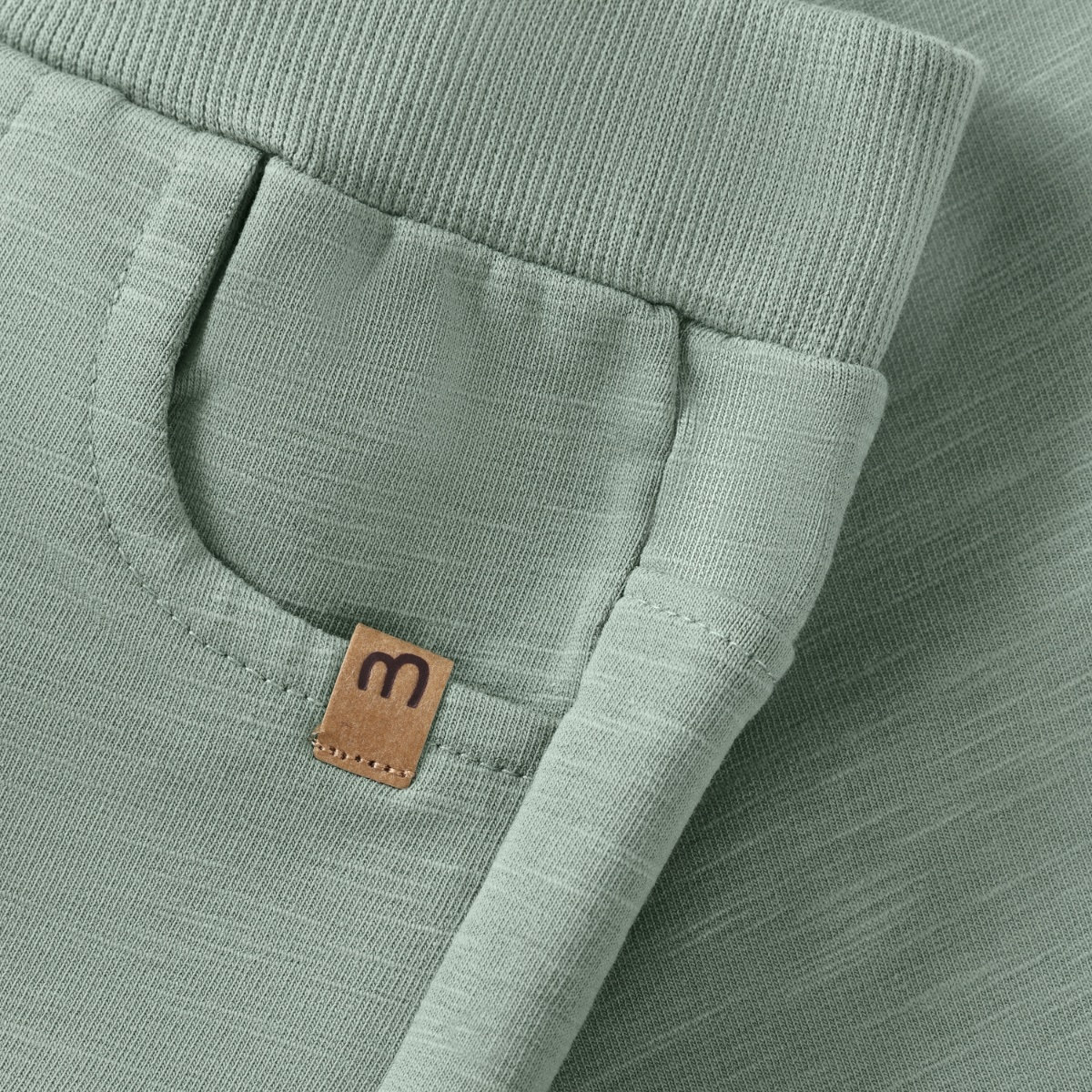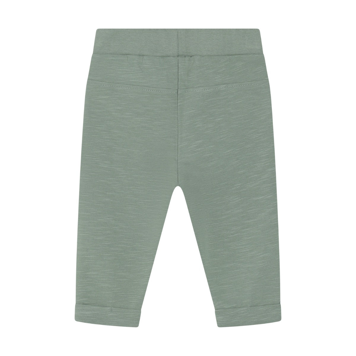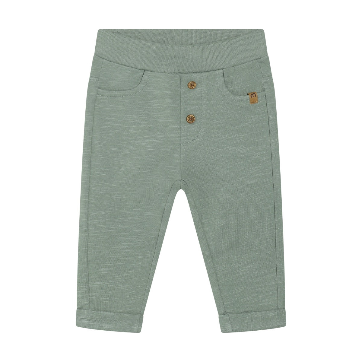 Sweat pants from Minymo. The pants have a solid-colored, mottled print. They have elastic at the waist and are folded up at the ankles. Additionally, they have decorative buttons and two front pockets. Made with certified organic cotton.