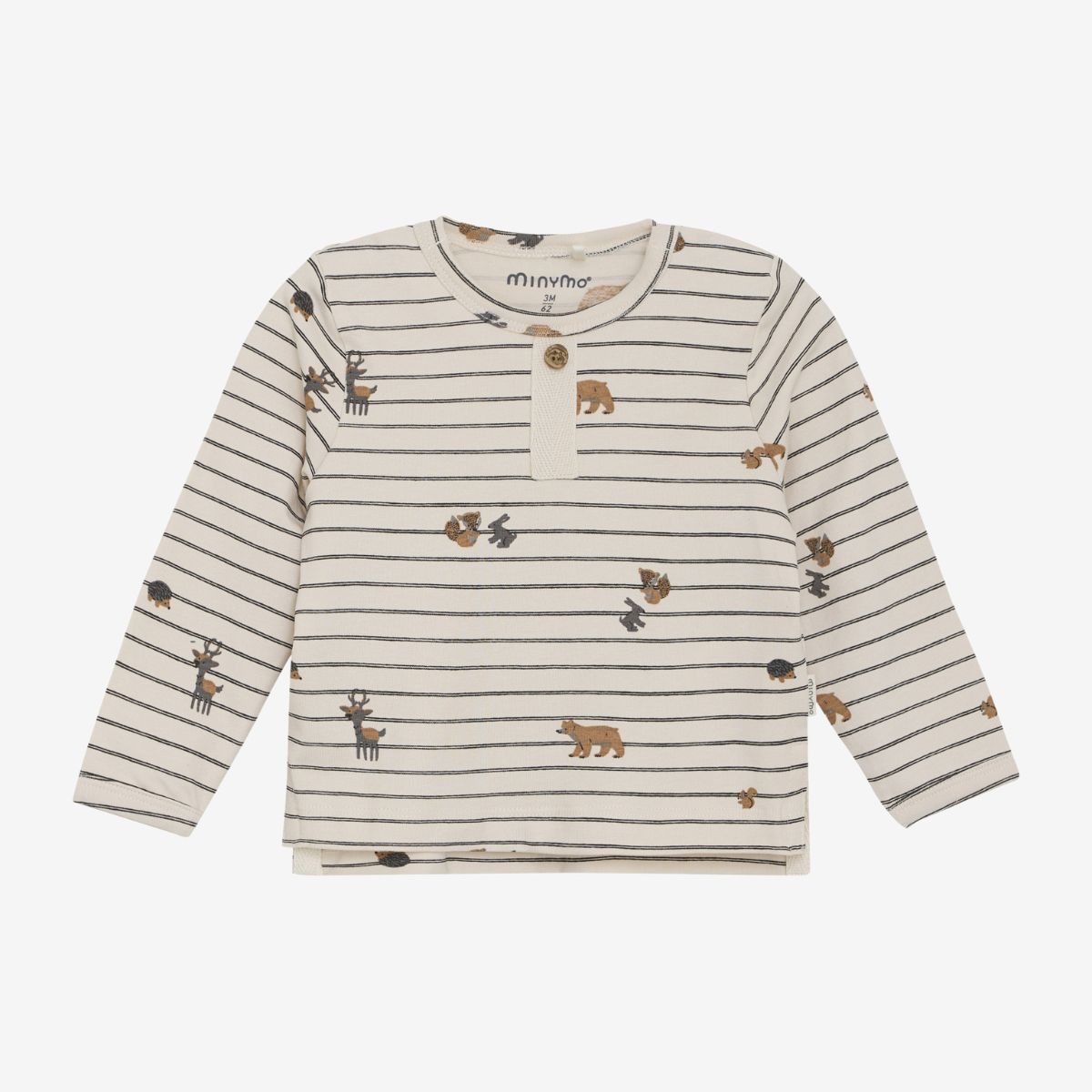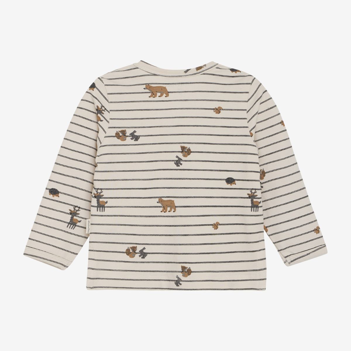 Long-sleeve T-shirt with stripes and a cute animal print. The T-shirt is made from a soft and comfortable fabric, perfect for both playtime and relaxation.