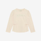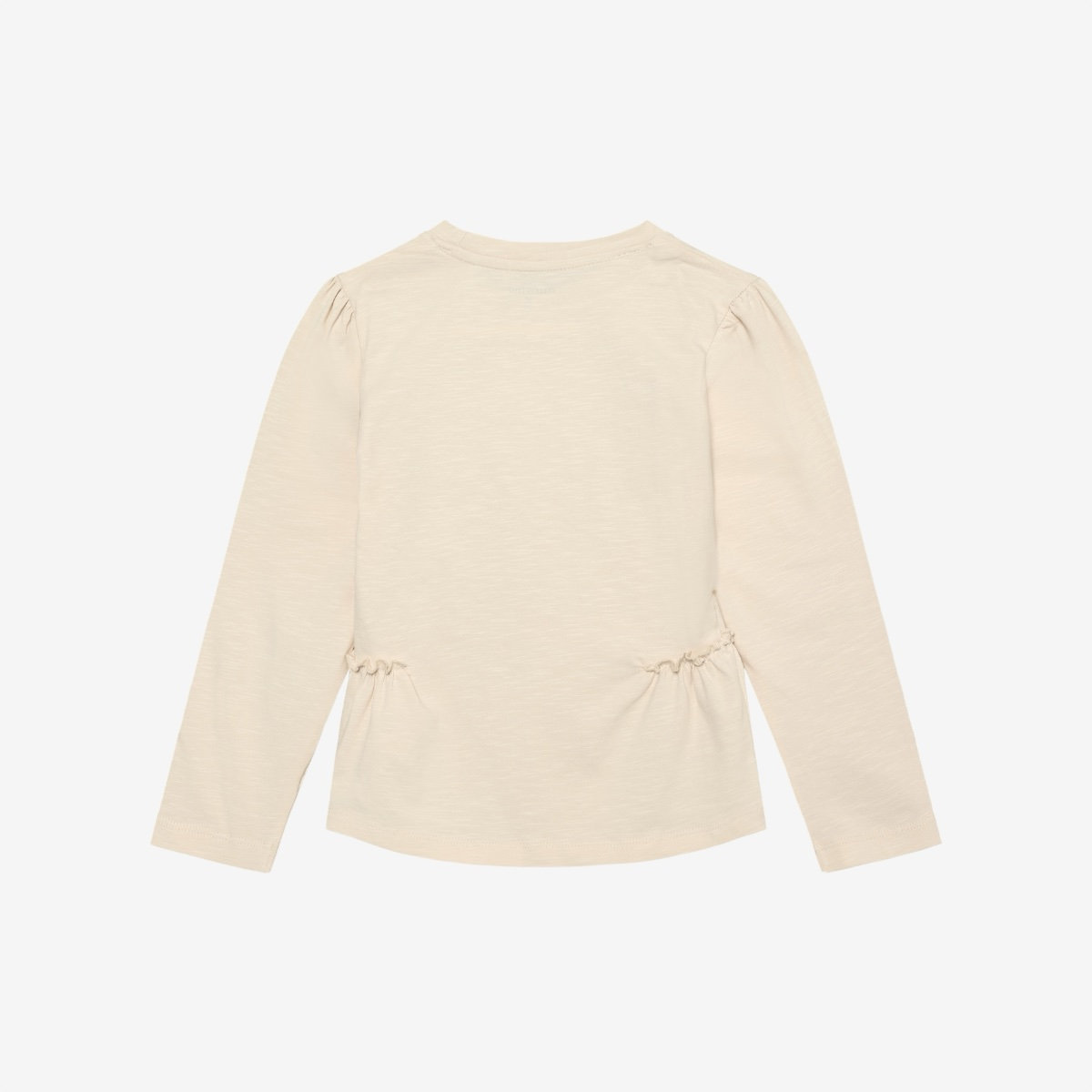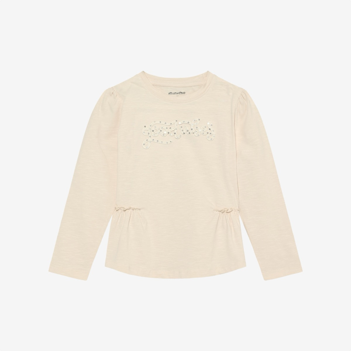 Long-sleeved T-shirt from Minymo. The shirt features lightly puffed shoulders, a print on the chest, and small decorative details at the waist. Designed with a round neckline.