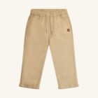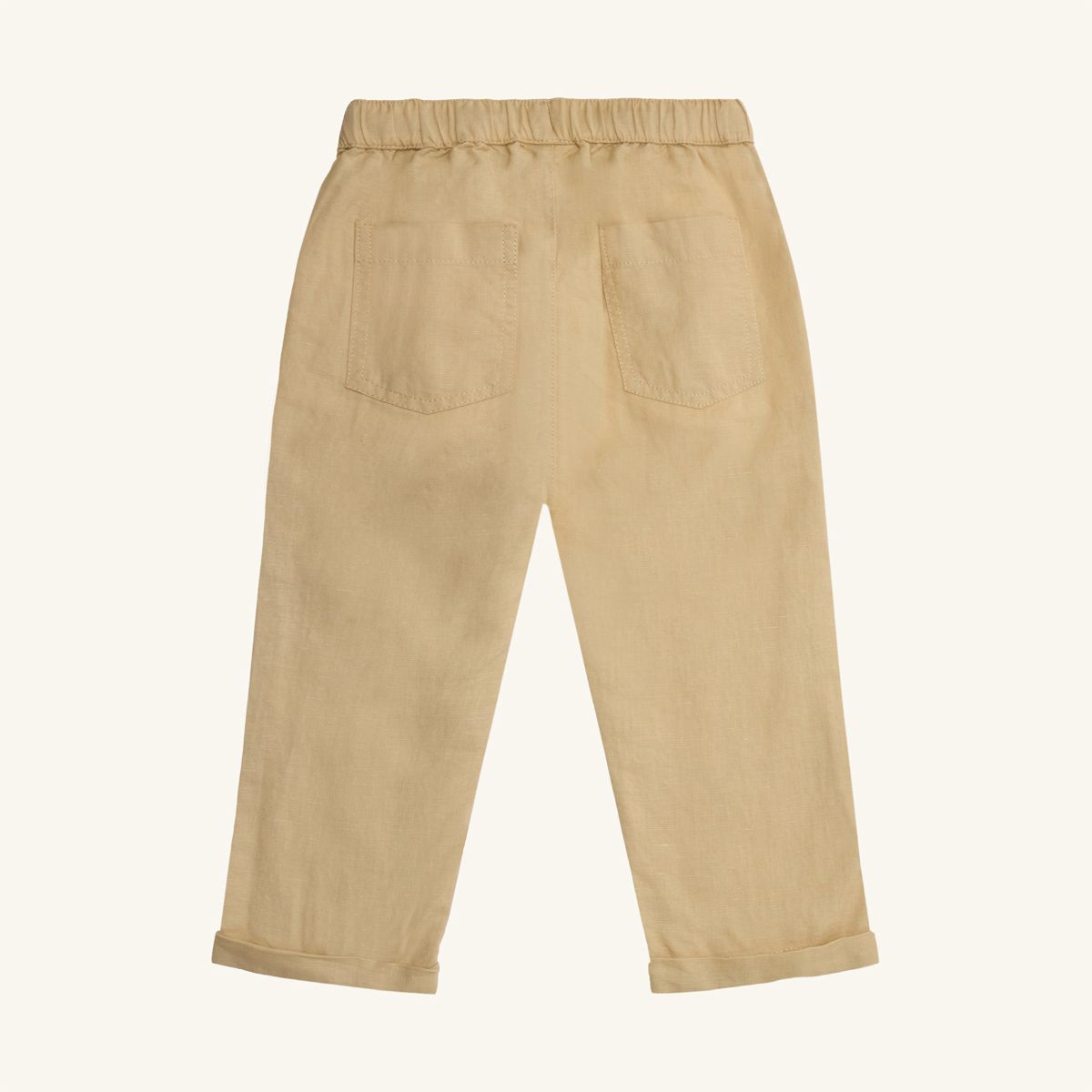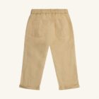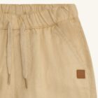 Woven linen trousers with elastic drawstring at the waist. The garment has both front and back pockets and pleated pockets.-Adjustable waist. This product is made of 50% organic cotton.