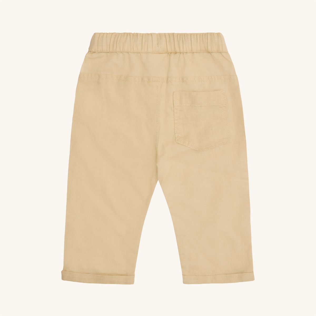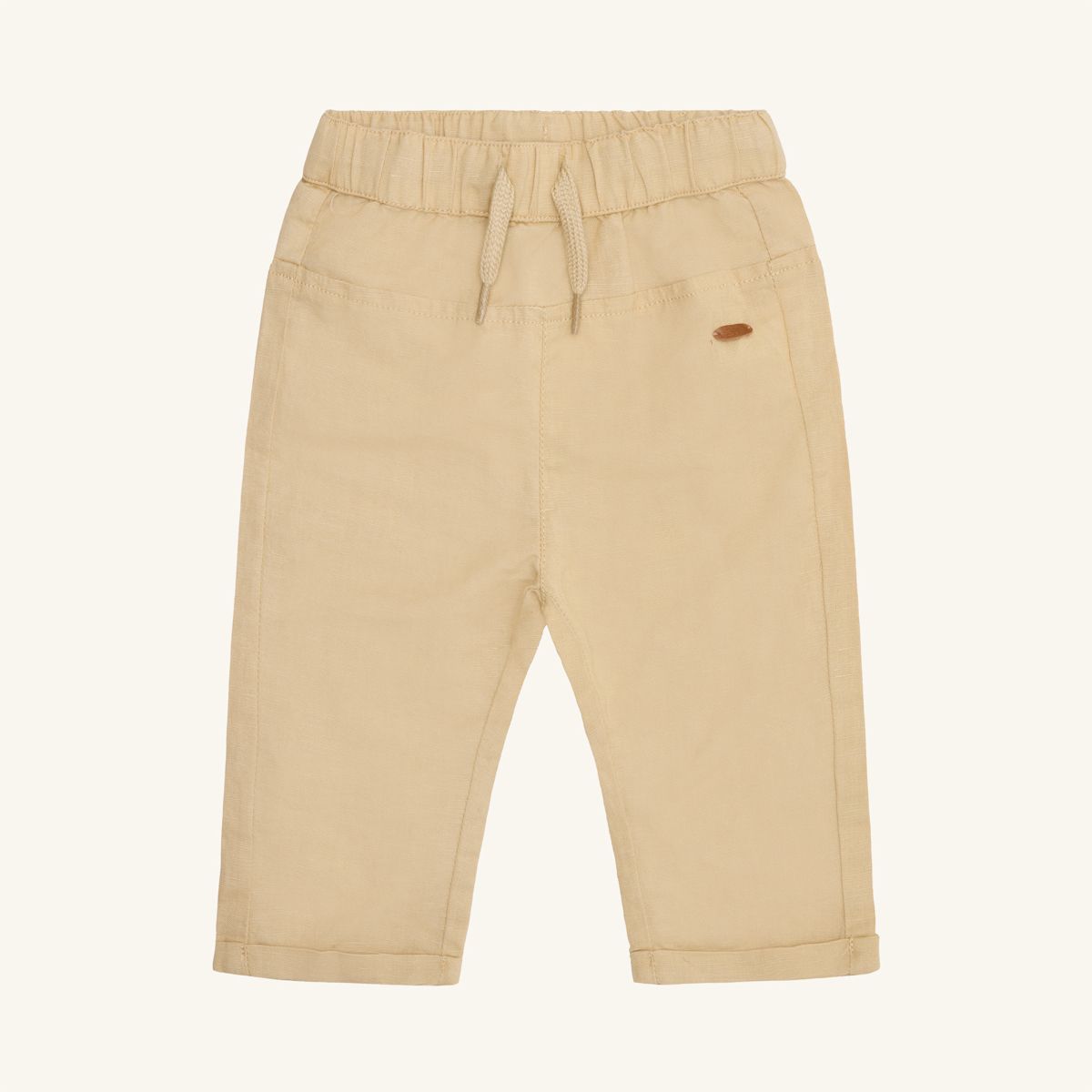 Woven linen trousers with an elasticated drawstring waist. These trousers have side pockets and a right back pocket, as well as a sewn pleat.-This product is made of 50% organic cotton.