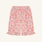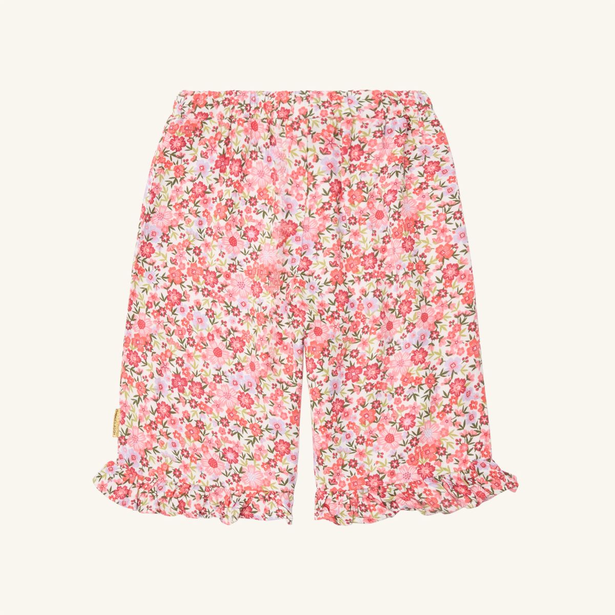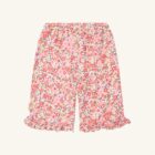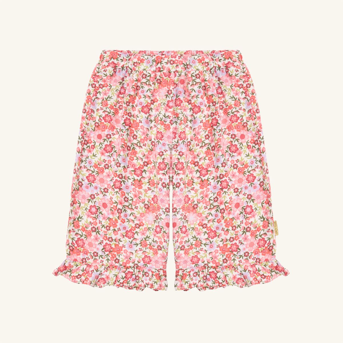Woven cotton trousers with a floral print and an elasticated waist. With ruffles at the ankles and an adjustable waist.