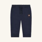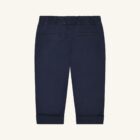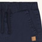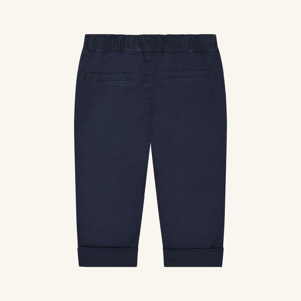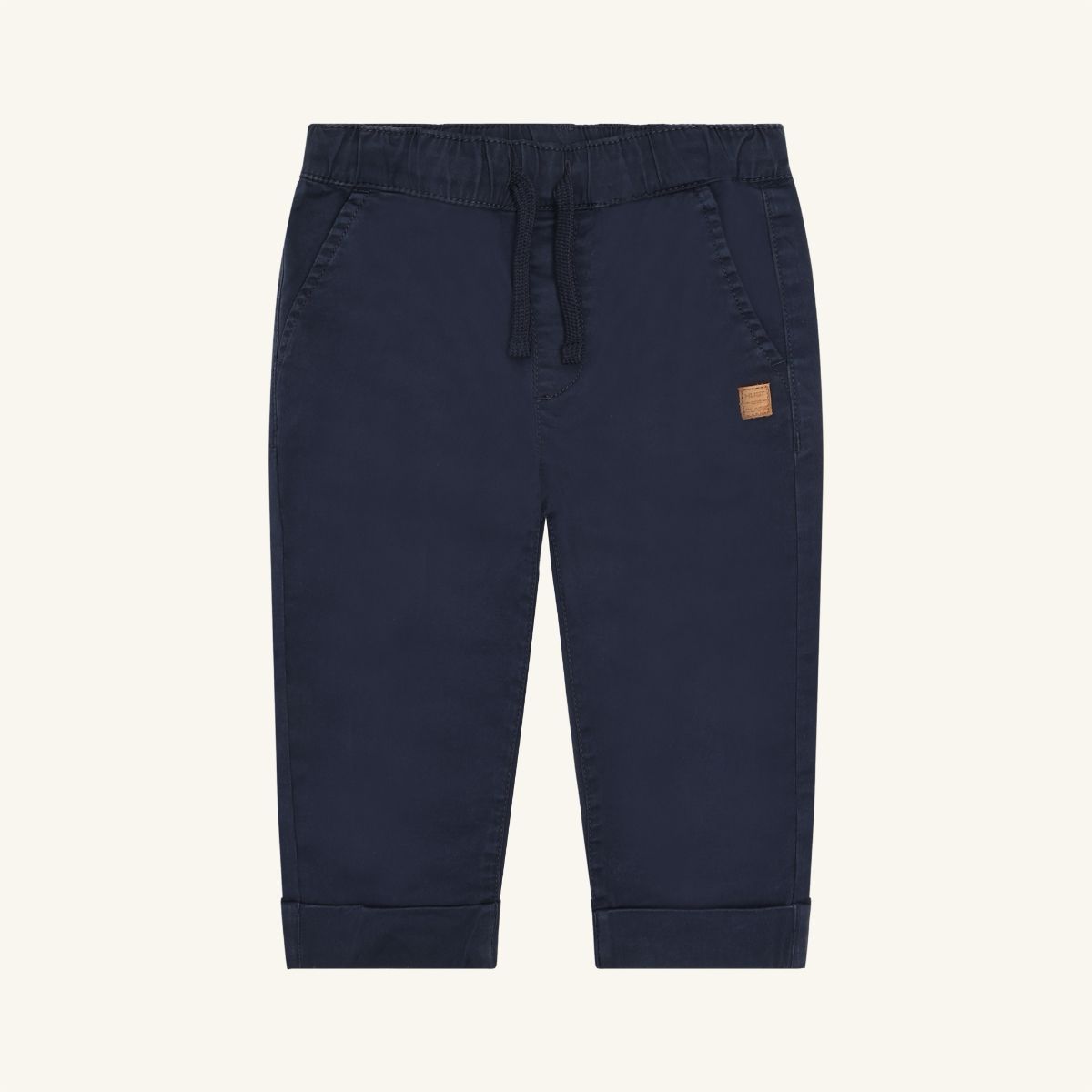 Pants in a cotton blend with front pockets. The style features an elastic waistband with drawstring for an adjustable and comfortable fit. The pants have turn-ups at the bottom for a smart look.